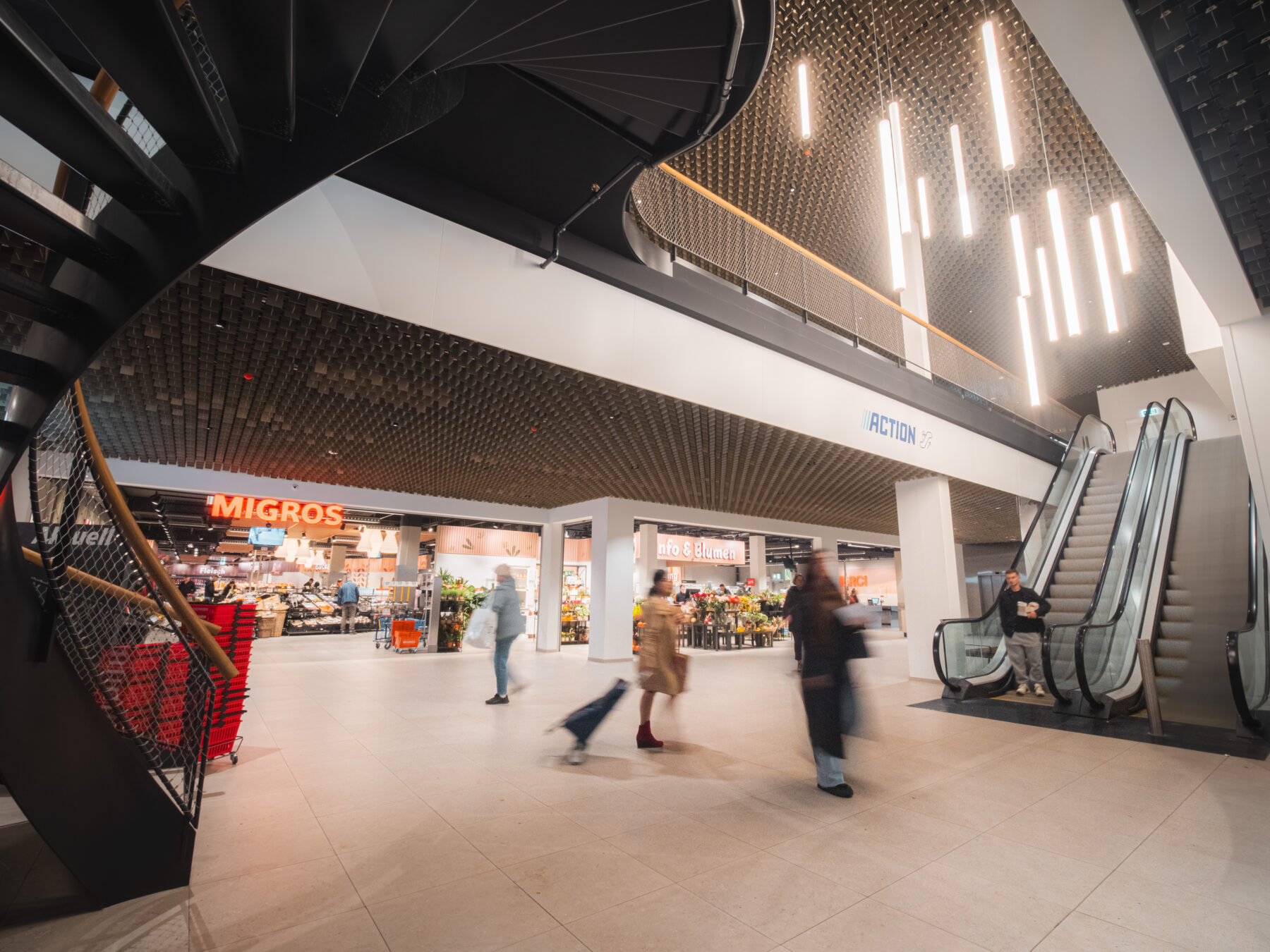 Seit dem Start des Umbaus im Februar 2024 blieb im und um das Center fast kein Stein auf dem anderen. Die Arbeiten umfassten unter anderem die Revitalisierung der Fassade und der Tiefgarage samt Neuerstellung der gesamten Signaletik, den Ersatz der Flachdächer, der Warenaufzüge, der Brandmelde- und Notlichtanlagen, der Gebäudeautomation und der Kälteanlagen sowie die Verbesserung der Visibilität ins 1. Obergeschoss durch die Öffnung der Decke im Eingangsbereich. Ausserdem wurde eine PV-Anlage zum Eigenverbrauch installiert und die Beleuchtung komplett auf LED-Technik umgerüstet. Mit dem Abschluss der Bauarbeiten kehrte für die bestehenden Mietparteien wieder mehr Ruhe ein. Für ihre Geduld in dieser teils herausfordernden Zeit wurde ihnen herzlich gedankt.